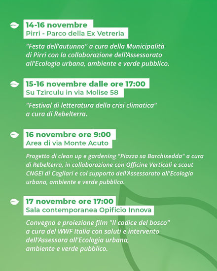 Dal 14 al 23 novembre a Cagliari si terrà la Settimana del Verde e dell'Ambiente, prima edizione di un appuntamento organizzato dall'assessorato alla Ecologia urbana, ambiente e verde pubblico del Comune di Cagliari.